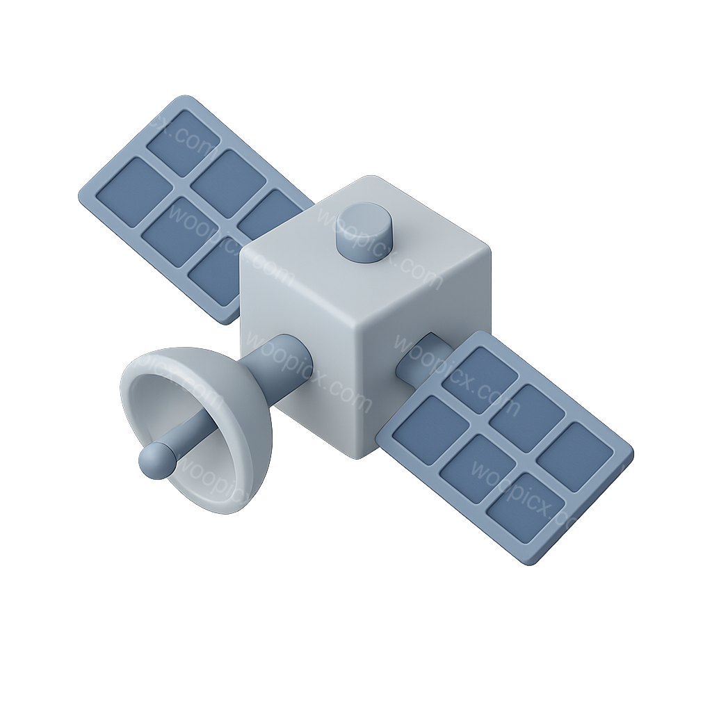A visually appealing 3D satellite icon featuring a cubic body and rectangular solar panels. The design is isometric with a three-quarter view, showcasing a modern, volumetric look.