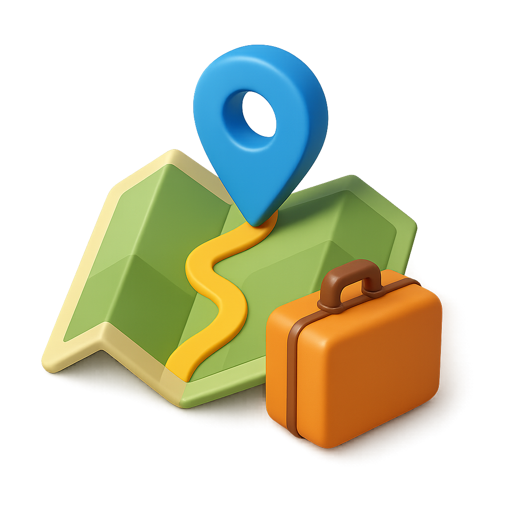 This image features a vibrant 3D icon depicting a stylized map with a winding road and a suitcase, all set against a soft gradient background, showcasing an isometric view.