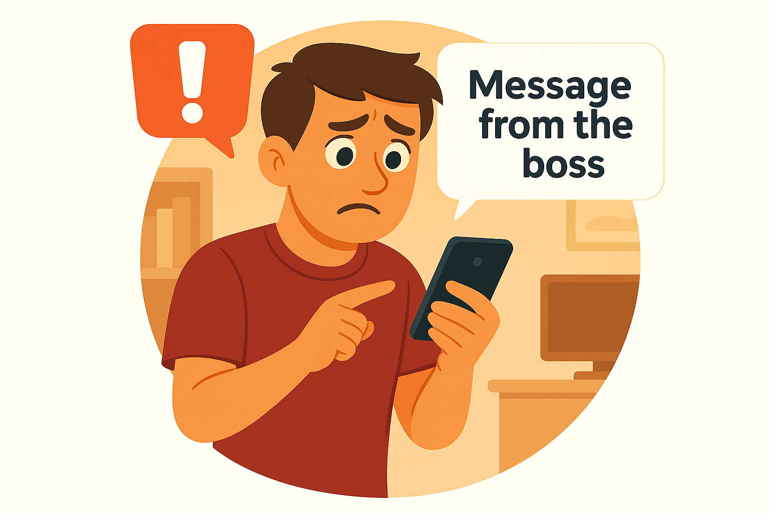 /Collection: /by davooda/Type: PNG/A digital illustration depicting a worried employee looking at their phone, receiving a message from their boss. The design features simple, modern graphics suitable for workplace communication themes.