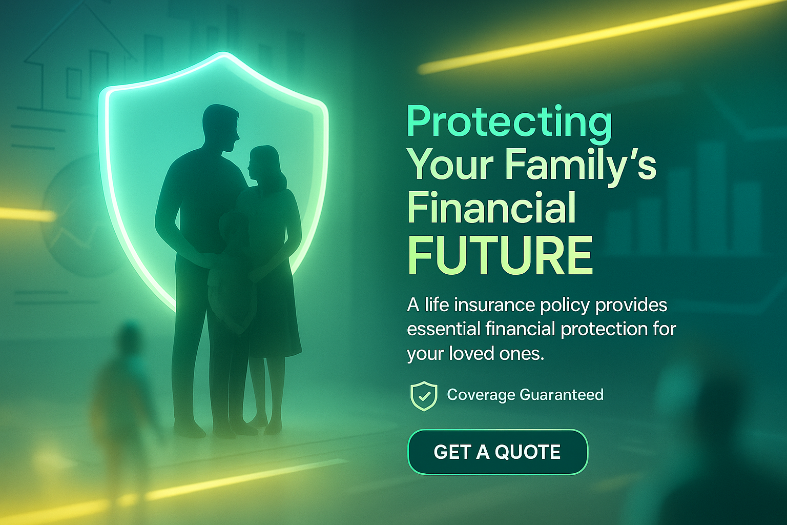 /Collection: /by davooda/Type: PNG/A visually engaging illustration representing family financial security through life insurance. The design features a glowing shield and silhouettes, suitable for insurance marketing.