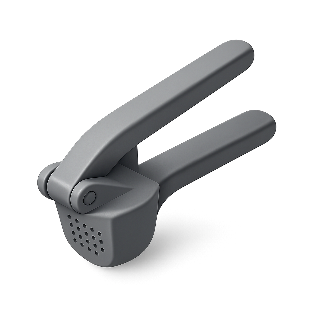 A 3D representation of a garlic press tool, shown in a three-quarter view. The design features a sleek, volumetric look with a transparent background, emphasizing its ergonomic handle and perforated head.