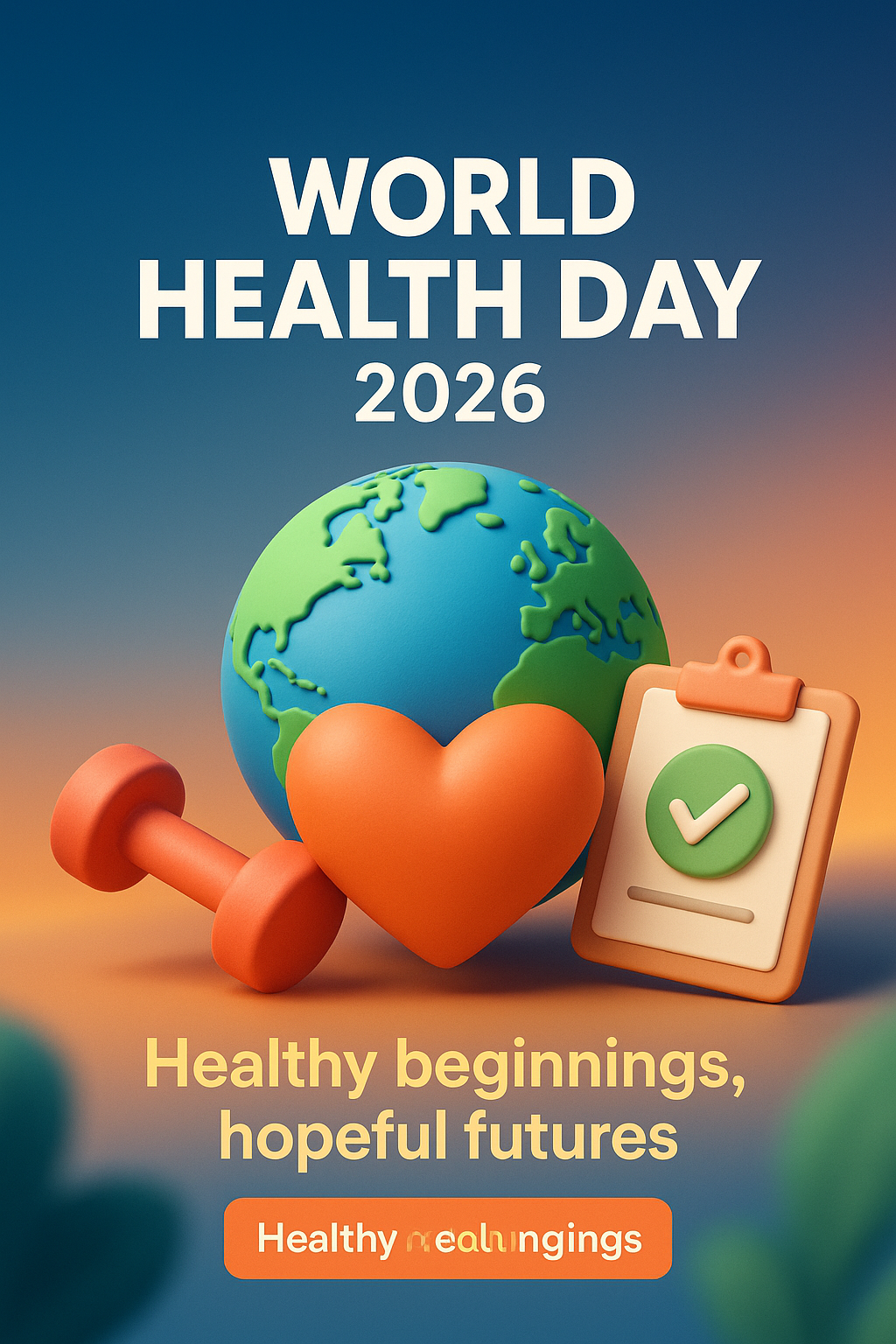 A vibrant graphic for World Health Day 2026 featuring health-related icons like a globe, heart, and fitness elements. Ideal for promotional use in health campaigns.
