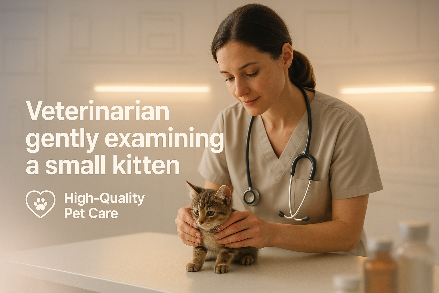 A warm and professional image showcasing a veterinarian gently examining a small kitten, ideal for promoting pet care services or veterinary clinics.
