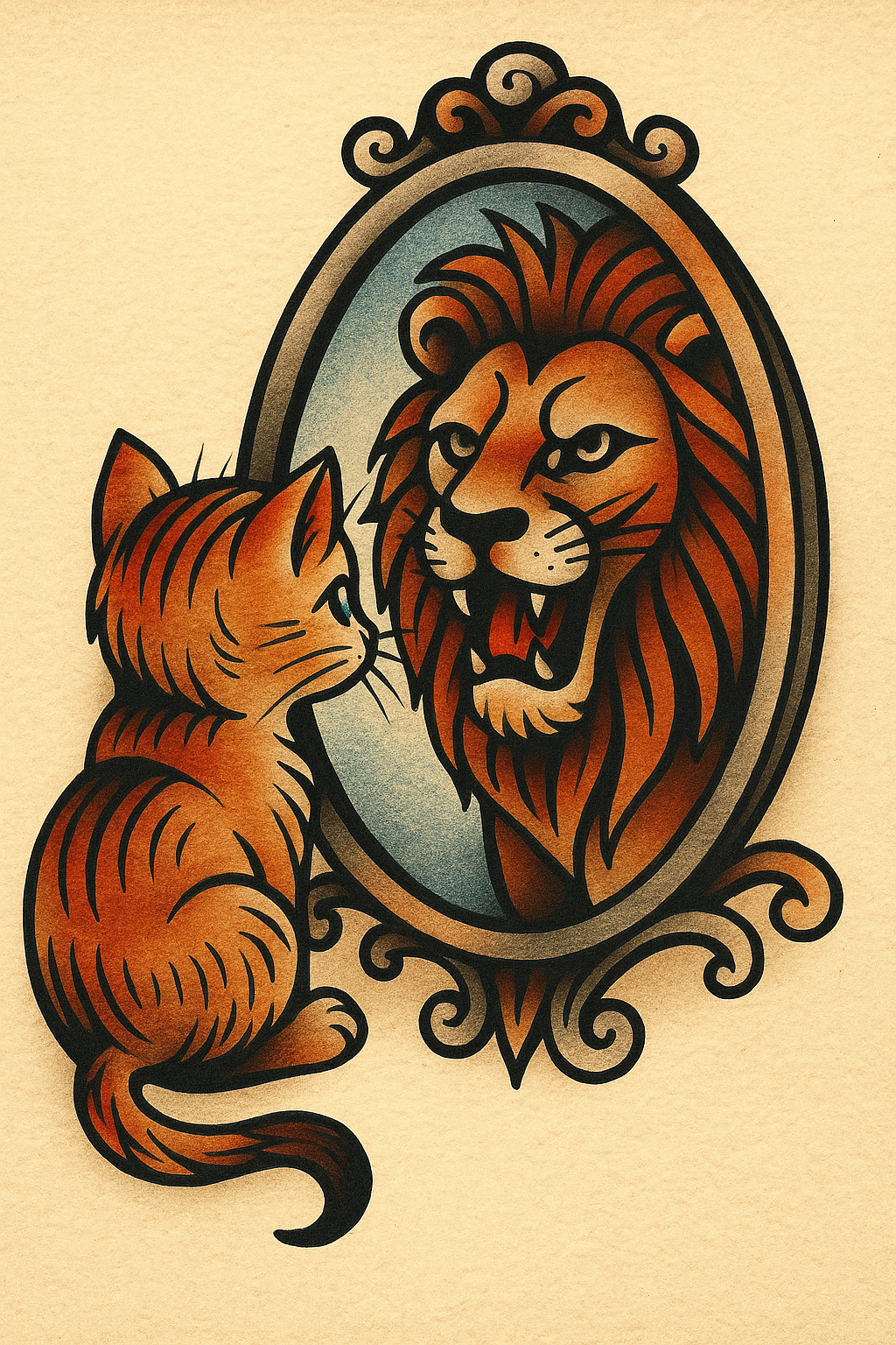 Kitten Gazing at Its Lion Reflection in a Tattoo Style