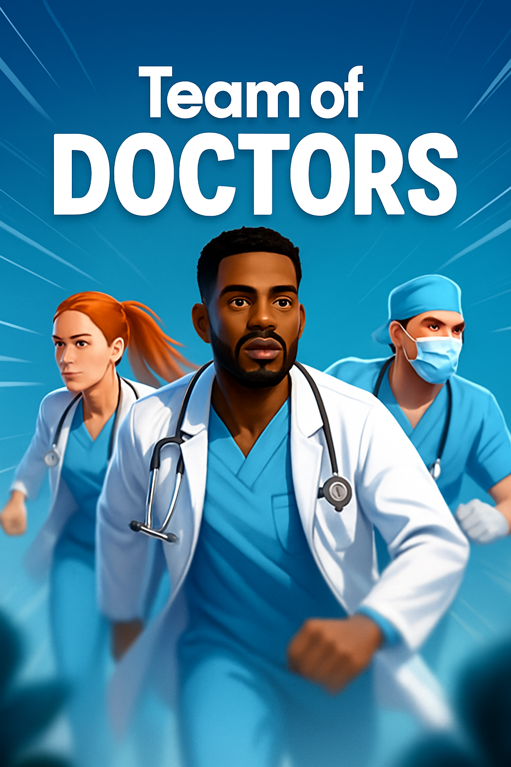 A vibrant illustration depicting a diverse team of doctors in action, showcasing a dynamic hospital environment with a gradient blue background and energetic elements.