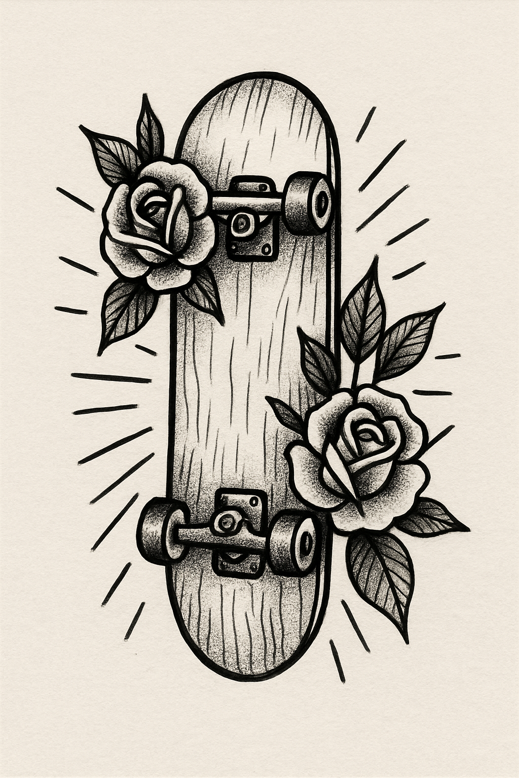 This image features a vintage-style illustration of a skateboard adorned with roses, showcasing a bold and edgy design ideal for tattoo enthusiasts and skate culture.