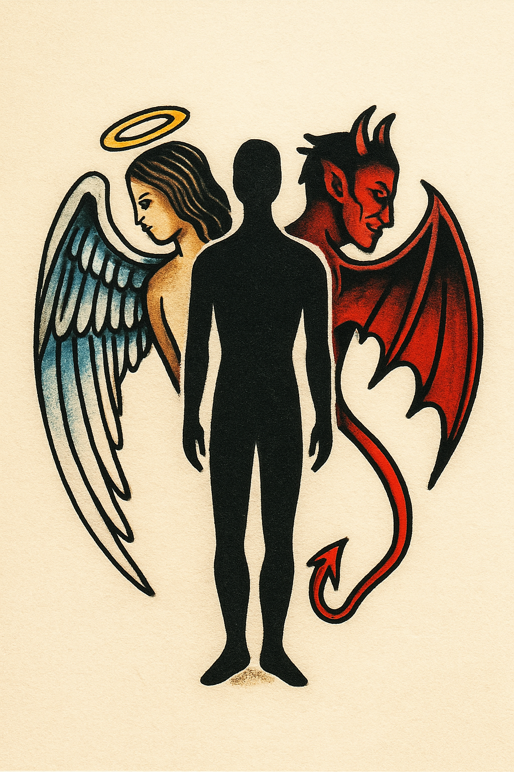 /Collection: /by davooda/Type: PNG/A striking tattoo design featuring a silhouette with dual shadows of an angel and a demon. The angel has wings and a halo, while the demon displays horns and a tail, all on a soft beige background.