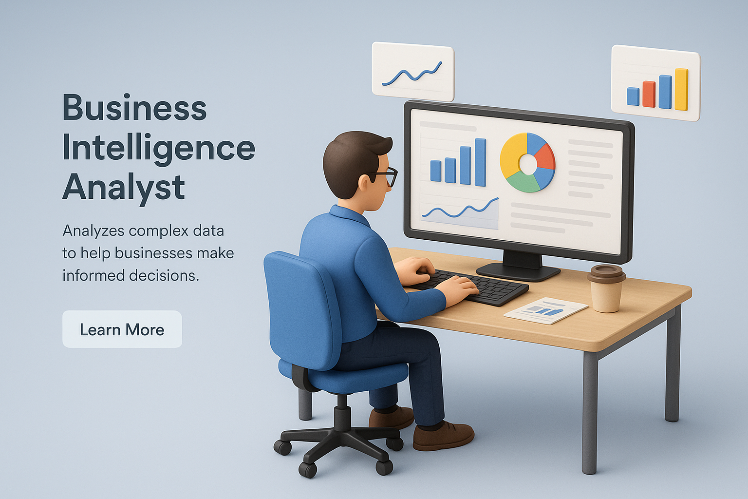 /Collection: /by davooda/Type: PNG/A detailed 3D illustration of a Business Intelligence Analyst working at a desk. The scene features a computer displaying charts and graphs, emphasizing data analysis in a professional setting.