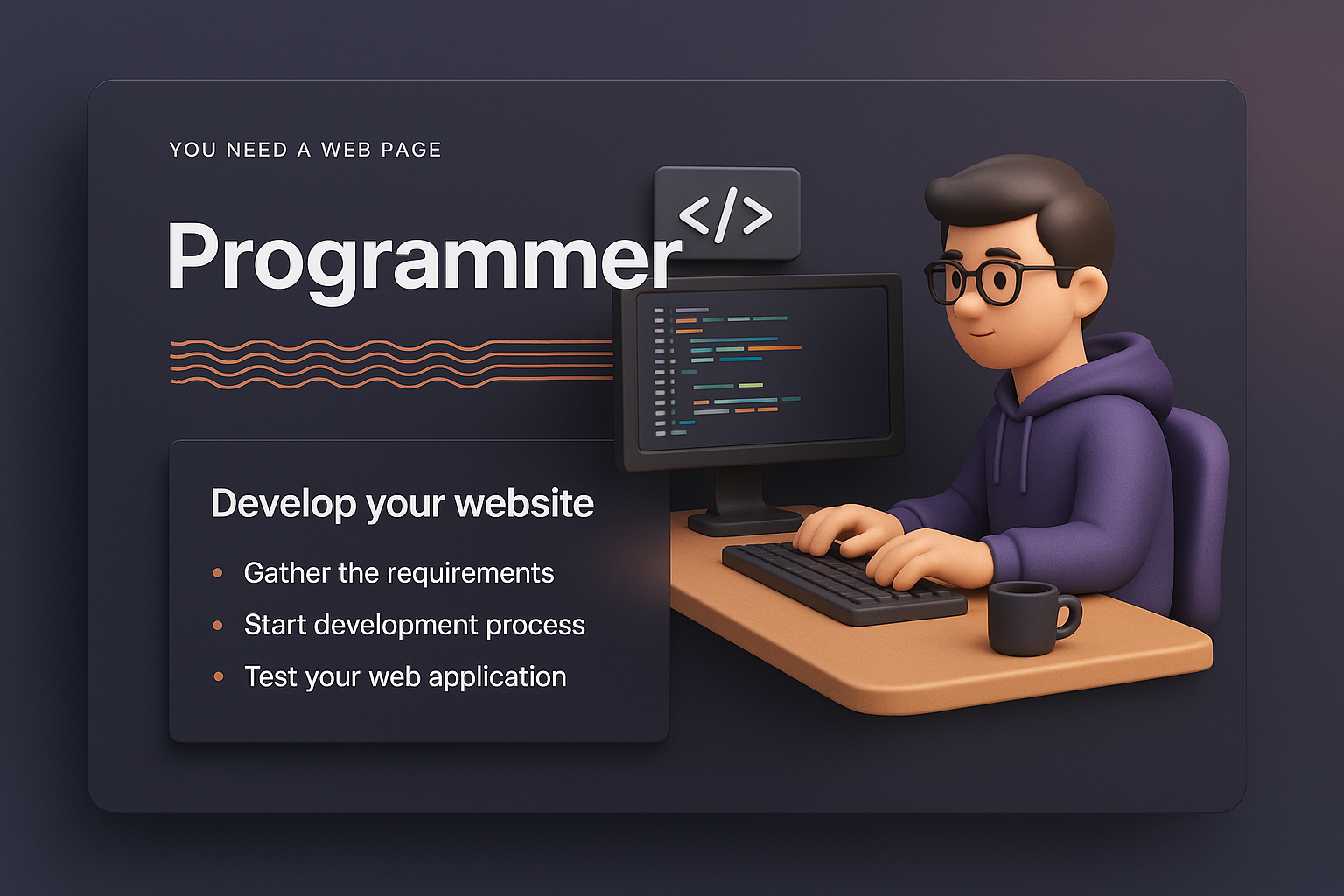 A 3D illustration showcasing a programmer working at a desk with a computer. The scene features a dark background, layered visual elements, and text blocks detailing web development steps.