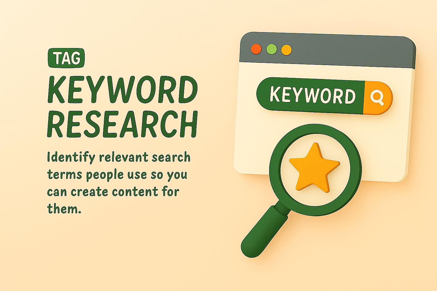 Illustrative graphic showcasing the concept of keyword research with a magnifying glass and a browser window, ideal for digital marketing content.
