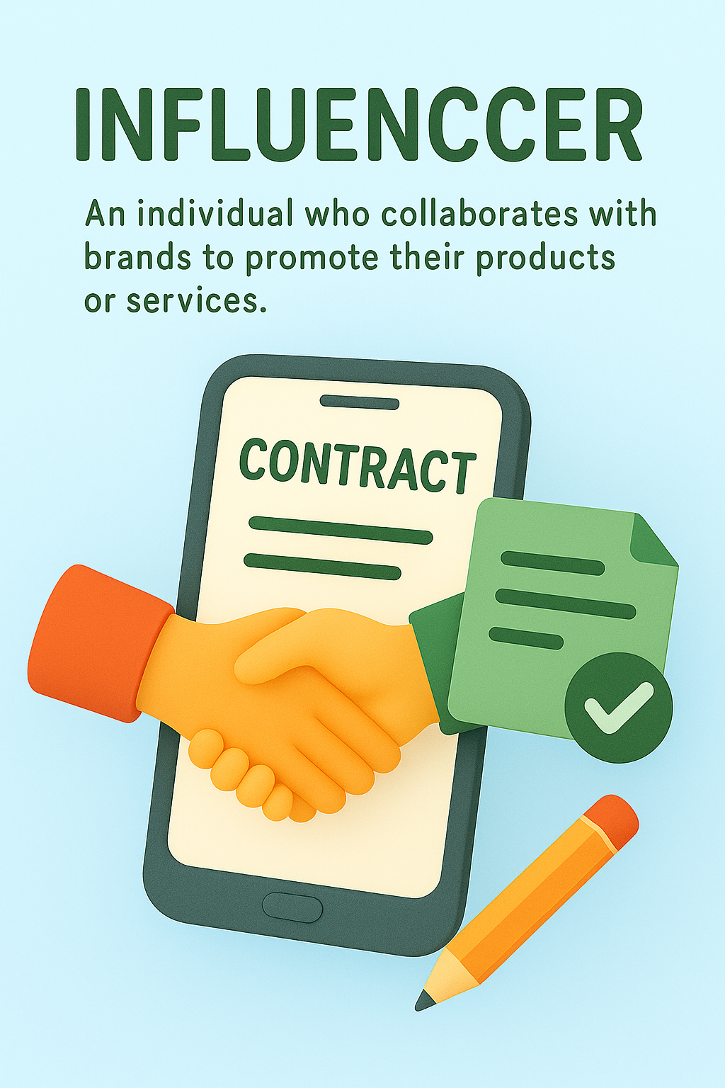 3D-style illustration showcasing the concept of influencer marketing, featuring a smartphone, handshake, and contract elements, ideal for educational or promotional content.