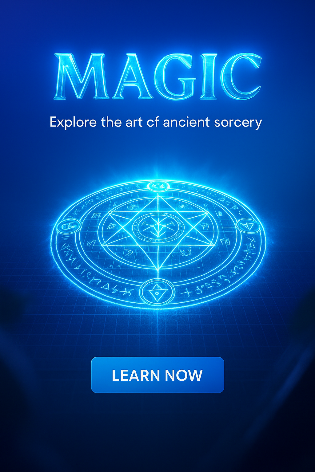 /Collection: /by davooda/Type: PNG/A vibrant blue scene featuring a glowing magic circle design. The title 'MAGIC' is prominently displayed above, complemented by an engaging subtitle and a call-to-action button. The composition is dynamic and visually captivating.