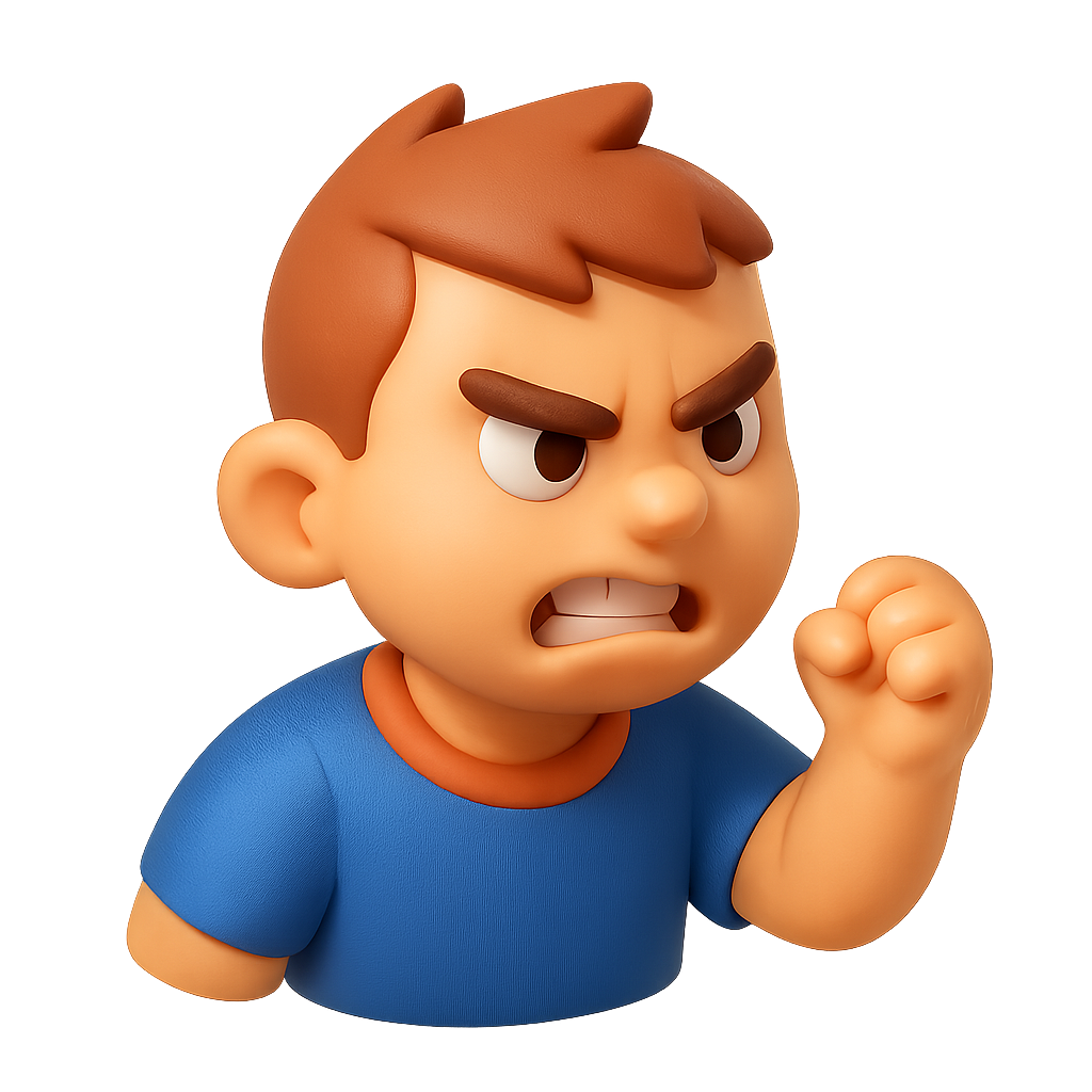 /Collection: /by davooda/Type: PNG/A stylized 3D icon of an angry boy with a clenched fist, wearing a blue shirt. The character is rendered in a three-quarter view, showcasing a playful yet aggressive expression.