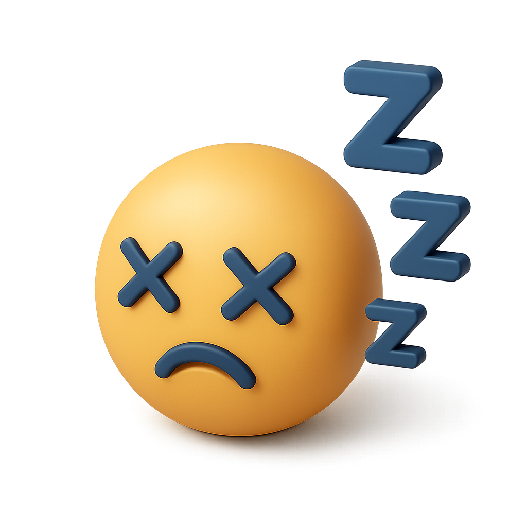 /Collection: /by davooda/Type: PNG/A 3D icon representing tiredness, featuring a yellow emoticon with crossed eyes and a frown, accompanied by floating 'Z' symbols. The design has a transparent background and a volumetric, isometric feel.