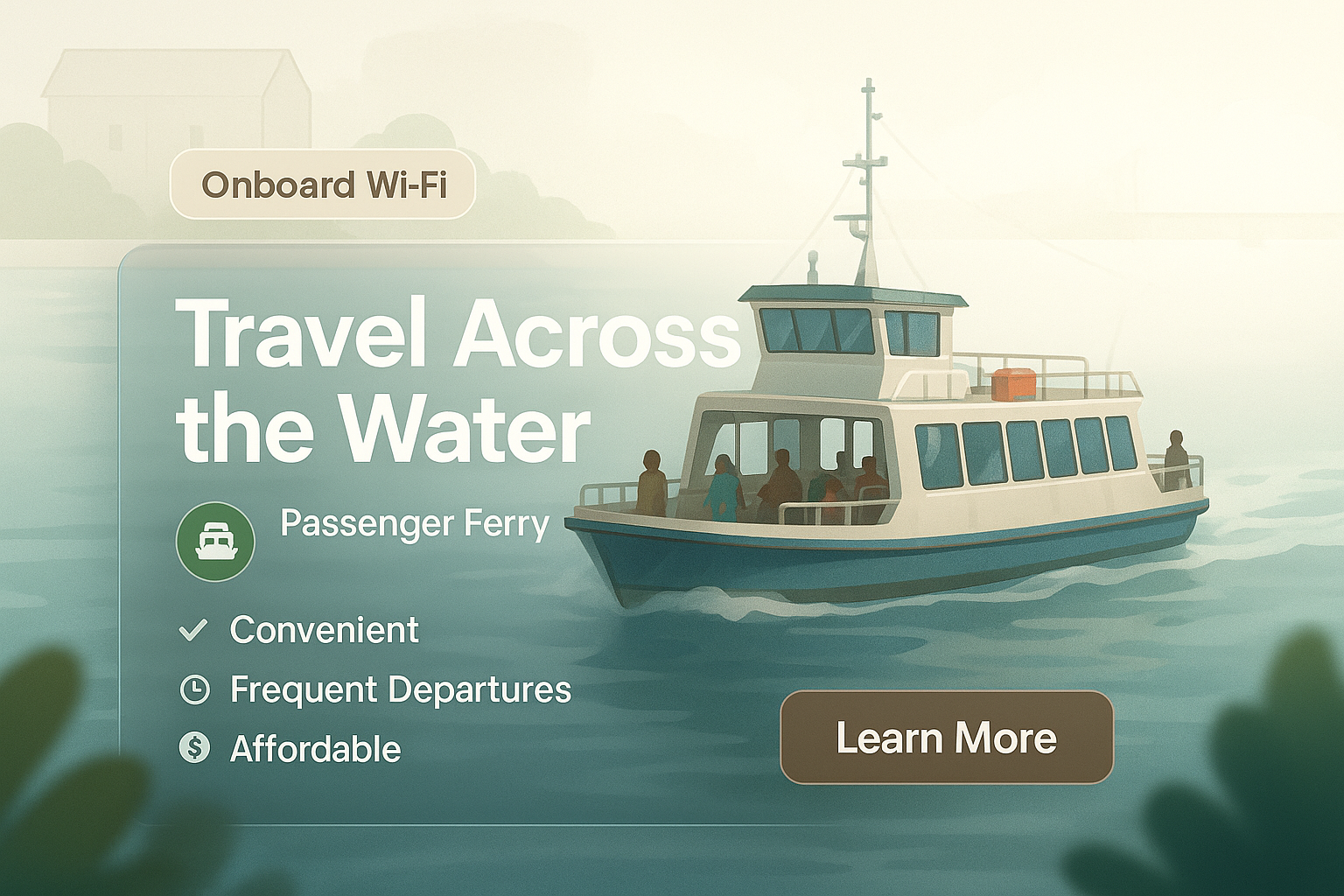 Illustrative graphic promoting a passenger ferry service with a serene water backdrop, showcasing amenities like onboard Wi-Fi and affordability, aimed at travelers.