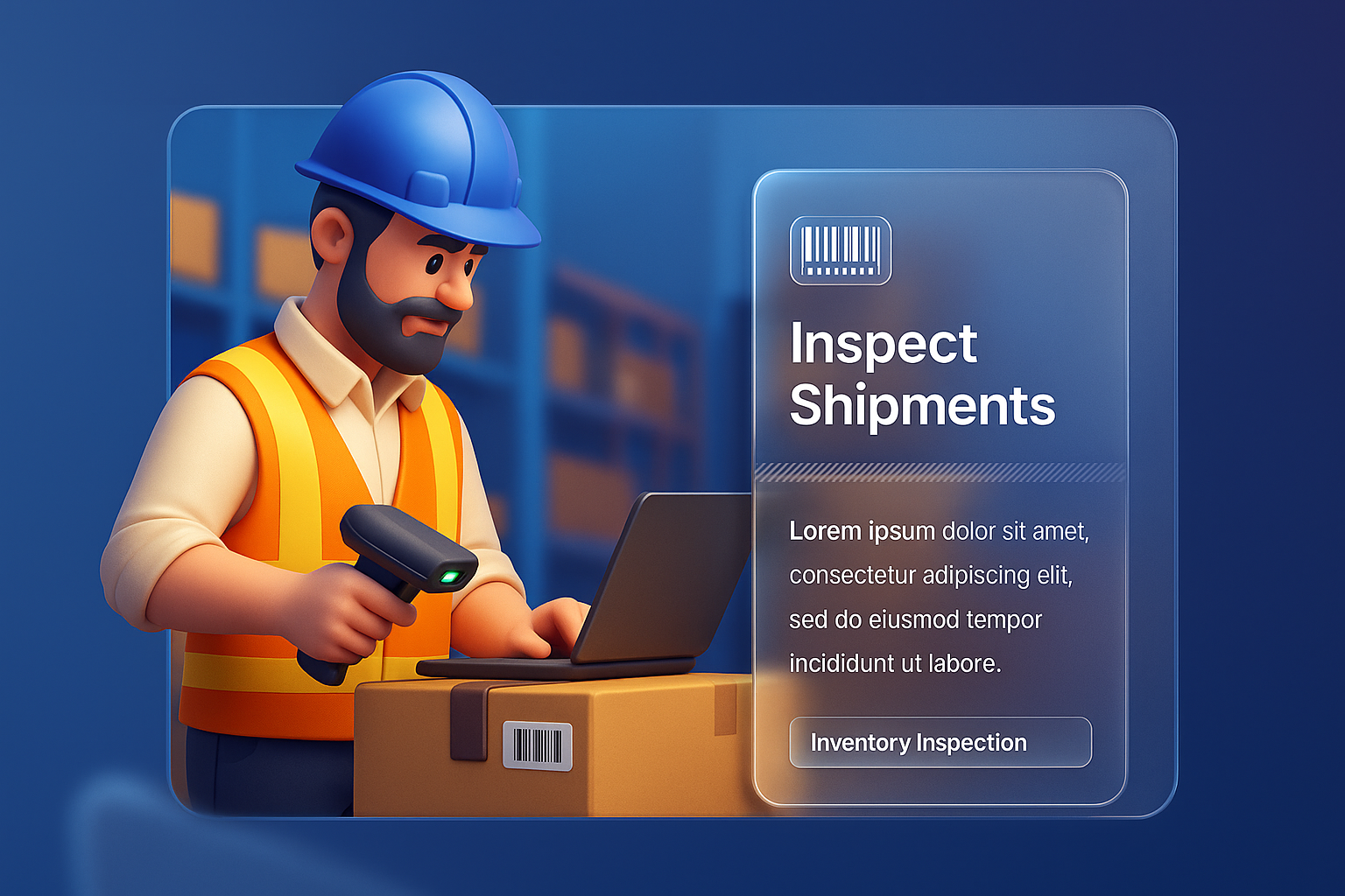 /Collection: /by davooda/Type: PNG/A warehouse engineer in a safety vest scans packages using a barcode scanner while working on a laptop. The background features a gradient with a professional and industrial theme.
