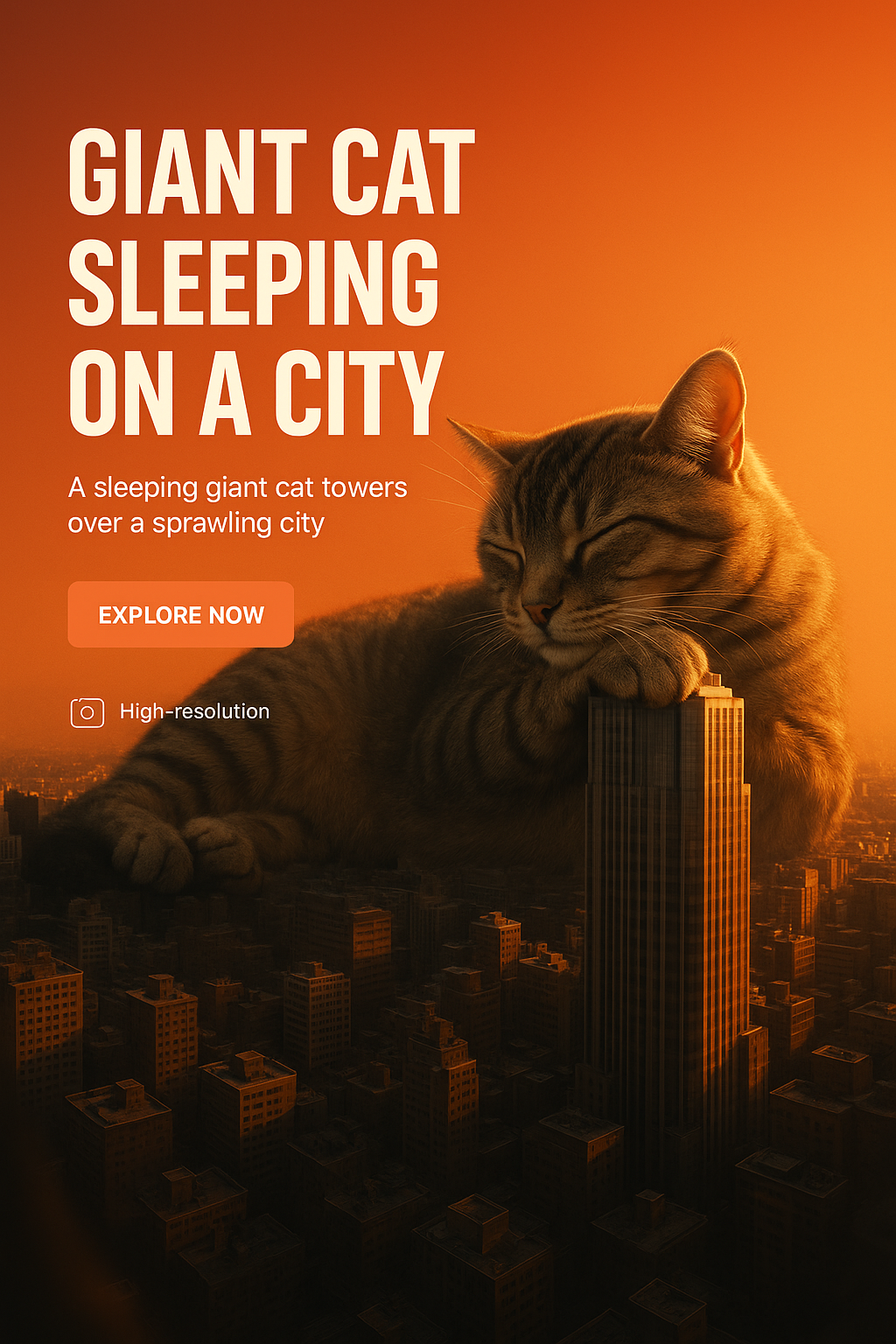 /Collection: /by davooda/Type: PNG/This image features a giant cat resting atop a skyscraper in a city, showcasing a whimsical and surreal theme. It's designed as a promotional graphic, ideal for social media or web use.