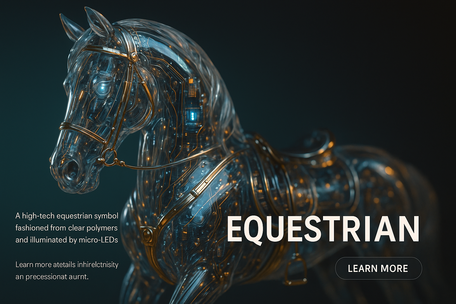 /Collection: /by davooda/Type: PNG/An intricate hyperrealistic sculpture of an equestrian figure, crafted from clear polymers and illuminated by micro-LEDs. The design features metallic components reflecting light elegantly.