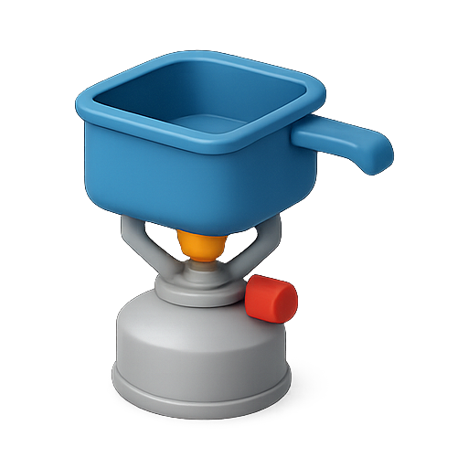 A vibrant and stylized illustration of a camping stove featuring a blue pot on top. The design is modern and playful, suitable for outdoor and cooking-related content.