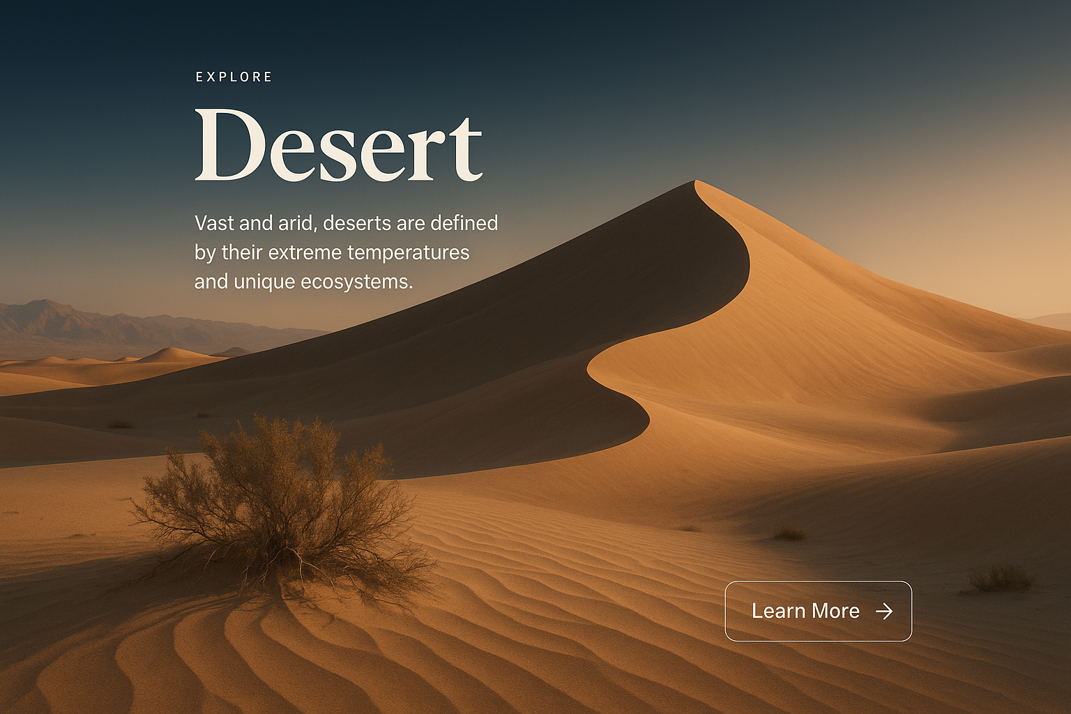 A visually appealing desert scene showcasing dunes and sparse vegetation. The layout includes a title, a brief description, and a call-to-action button, emphasizing readability.