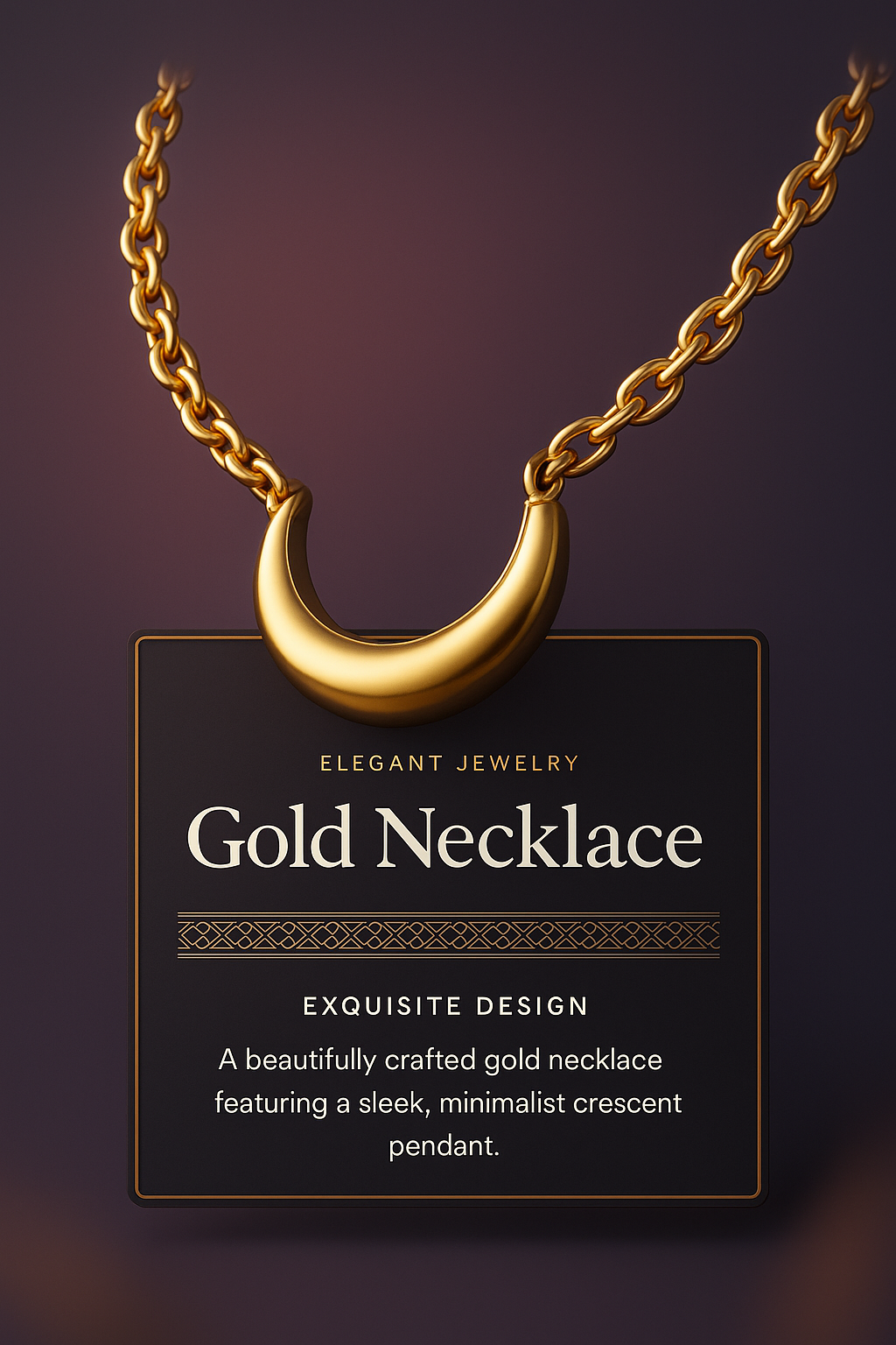 /Collection: /by davooda/Type: PNG/A stunning 3D illustration of a gold necklace featuring a sleek, minimalist crescent pendant. The design incorporates a dark label with elegant typeface, enhancing its luxurious appeal.