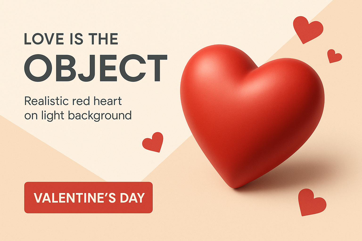 An abstract Valentine's Day background featuring a realistic red heart on a light backdrop. The design is modern with contrasting colors, bold typography, and dynamic elements.