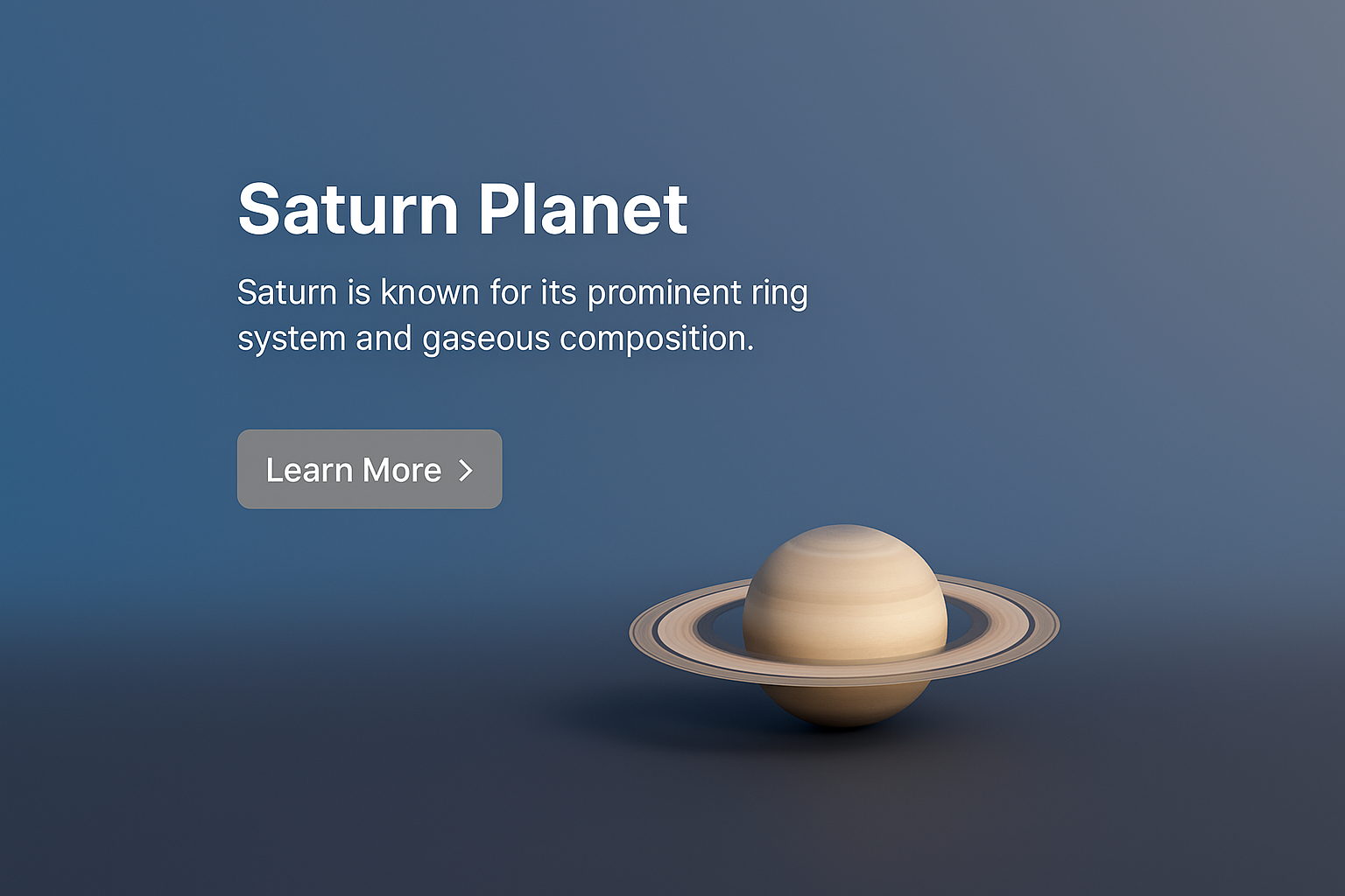 /Collection: /by davooda/Type: PNG/A detailed 3D illustration of Saturn, showcasing its iconic rings against a smooth gradient background. The scene includes informative text and a call to action button.