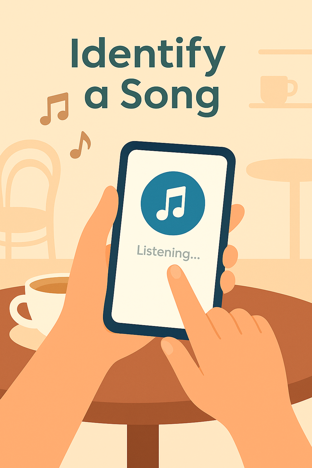 /Collection: /by davooda/Type: PNG/Illustration showcasing a mobile app interface for identifying songs, featuring a hand holding a smartphone with a music note symbol, ideal for tech-related content.