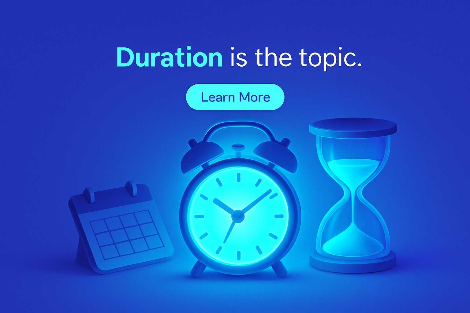 An eye-catching design featuring a glowing clock, calendar, and hourglass, embodying the concept of duration against a vibrant blue background.