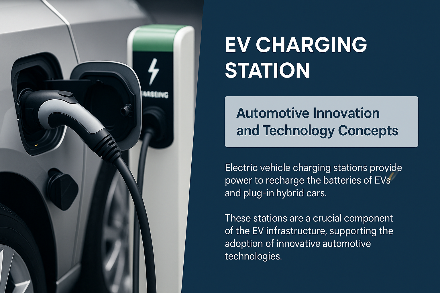 Informative graphic showcasing an EV charging station with a focus on automotive innovation, suitable for technology and sustainability discussions.
