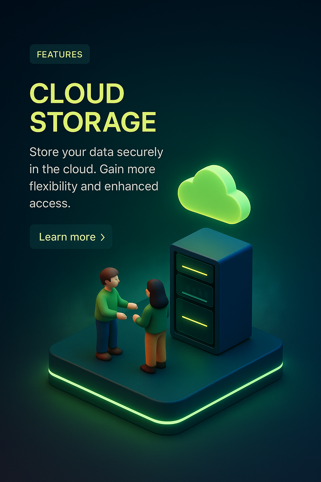/Collection: /by davooda/Type: PNG/A vibrant 3D scene illustrating cloud storage features, featuring neon accents and two characters shaking hands beside a glowing cloud icon. The background is a smooth gradient.