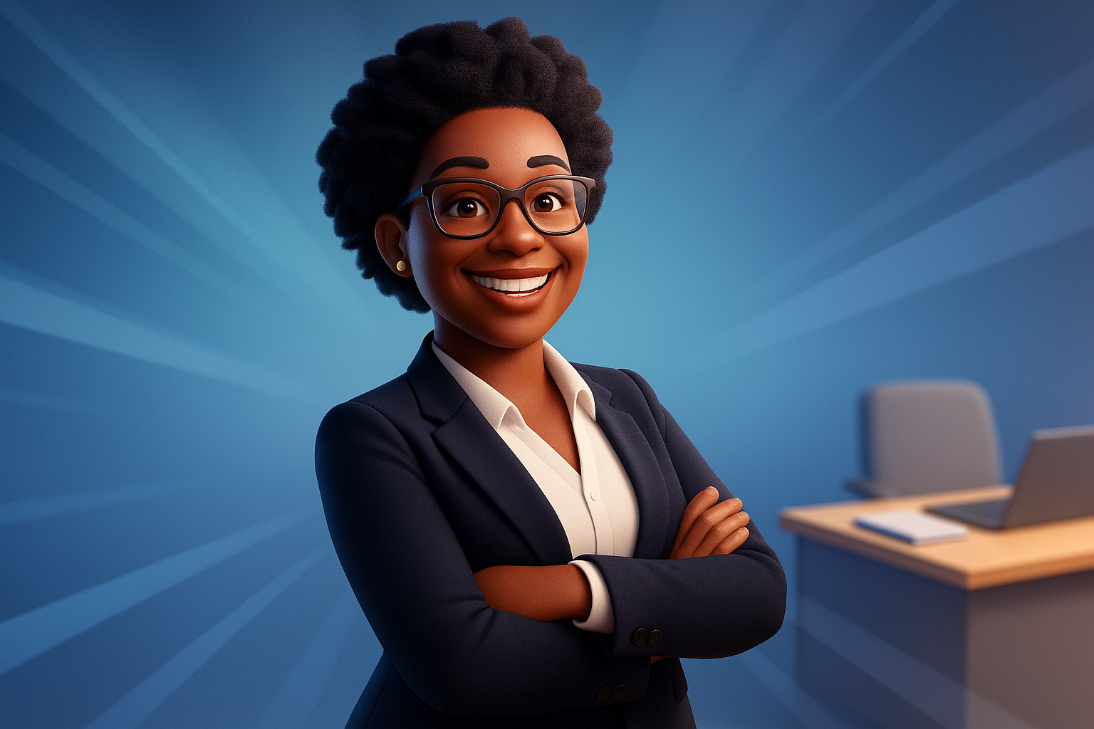 /Collection: /by davooda/Type: PNG/A cheerful middle-aged Afro woman CEO, wearing glasses and smiling, stands confidently with arms crossed in a vibrant office environment. The background features dynamic rays and a smooth gradient.