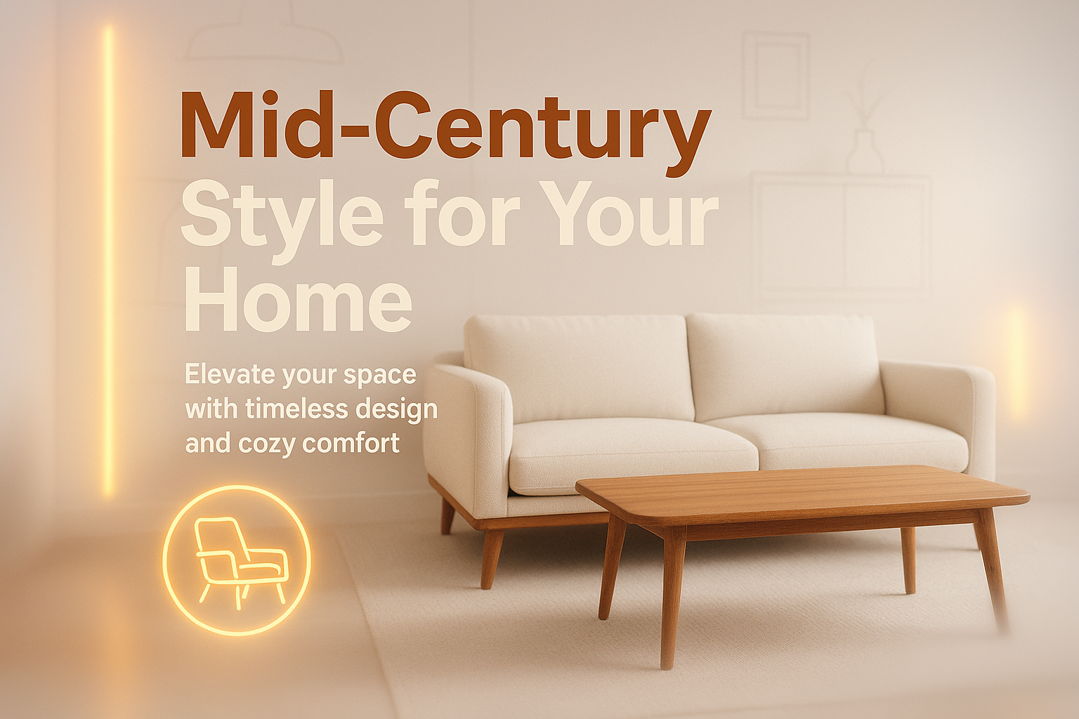 Stylish promotional graphic highlighting mid-century interior design elements. Ideal for home decor marketing and lifestyle branding.