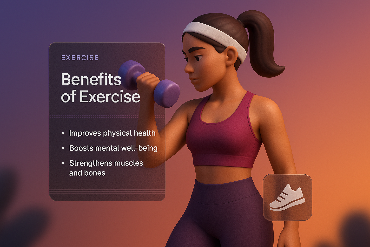 /Collection: /by davooda/Type: PNG/A visually striking 3D illustration highlighting exercise benefits. The design features a character lifting weights, with a transparent panel displaying key points on health and wellness.