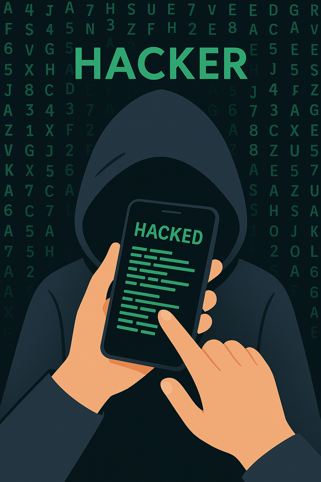 /Collection: /by davooda/Type: PNG/Stylized digital illustration showcasing a hacker in a hoodie interacting with a smartphone. The design features a dark color palette and a background of binary code, making it suitable for tech-related content.