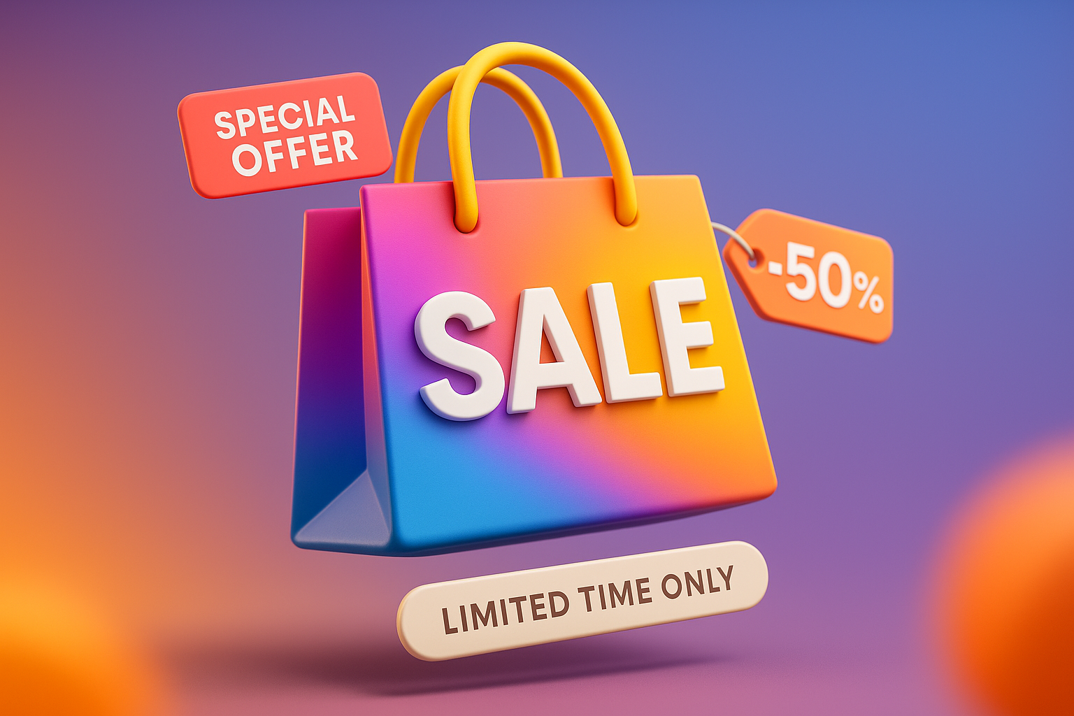 A dynamic 3D graphic of a shopping bag featuring a vibrant gradient design. Ideal for promotional materials and e-commerce advertising, highlighting a special sale.