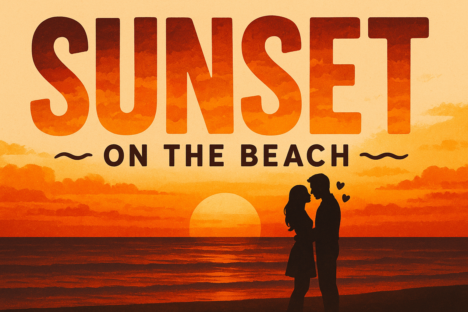 Vibrant graphic depicting a romantic sunset on the beach featuring a silhouetted couple, perfect for love-themed events or promotional materials.