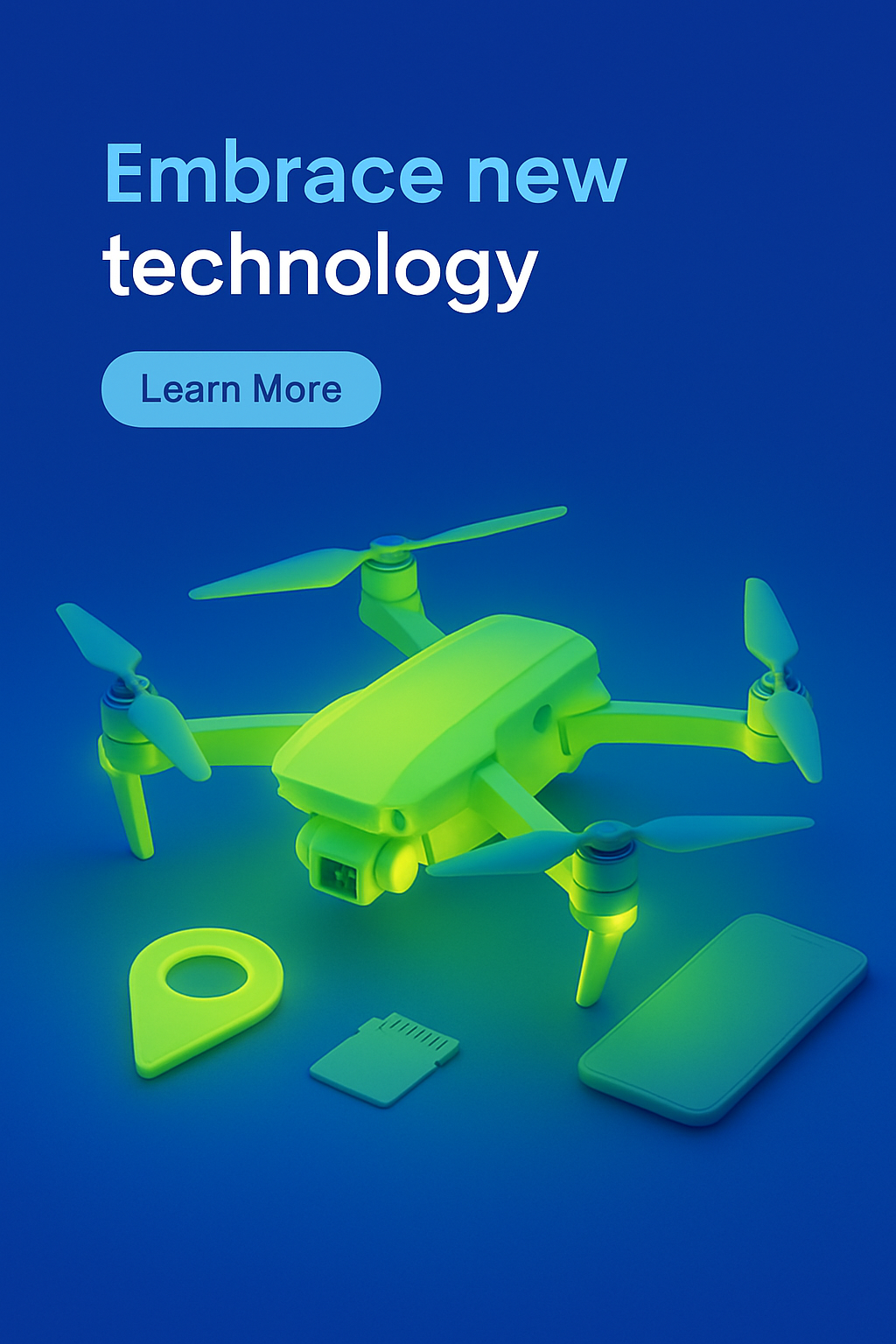 /Collection: /by davooda/Type: PNG/A modern drone displayed against a solid blue background, emitting a light yellow-green glow. The scene includes a smartphone and a memory card, all subtly illuminated, enhancing the technological theme.