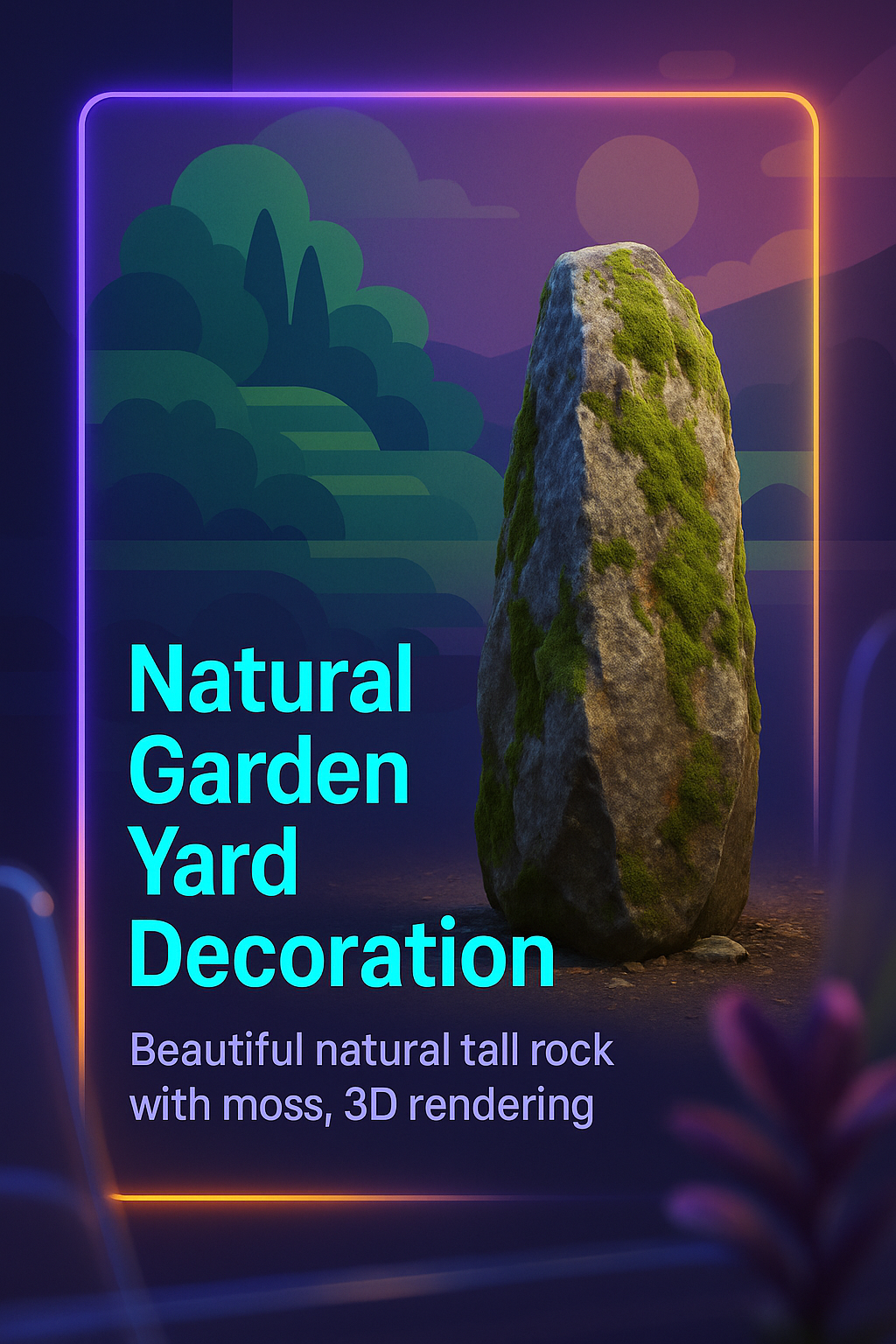 A visually striking 3D rendering of a tall natural rock adorned with moss, set in a serene garden landscape. Ideal for landscaping and gardening design inspiration.