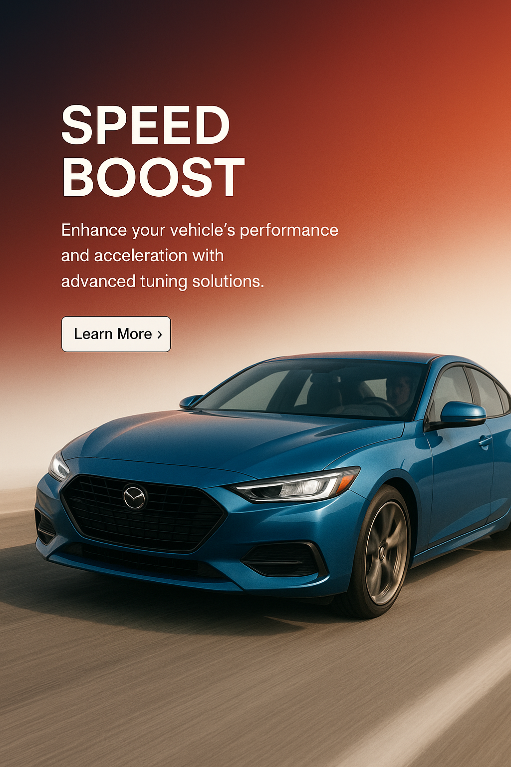A sleek web design featuring a blue car in motion, highlighting performance enhancement with a clean gradient background. The layout includes a bold title and a call-to-action button.