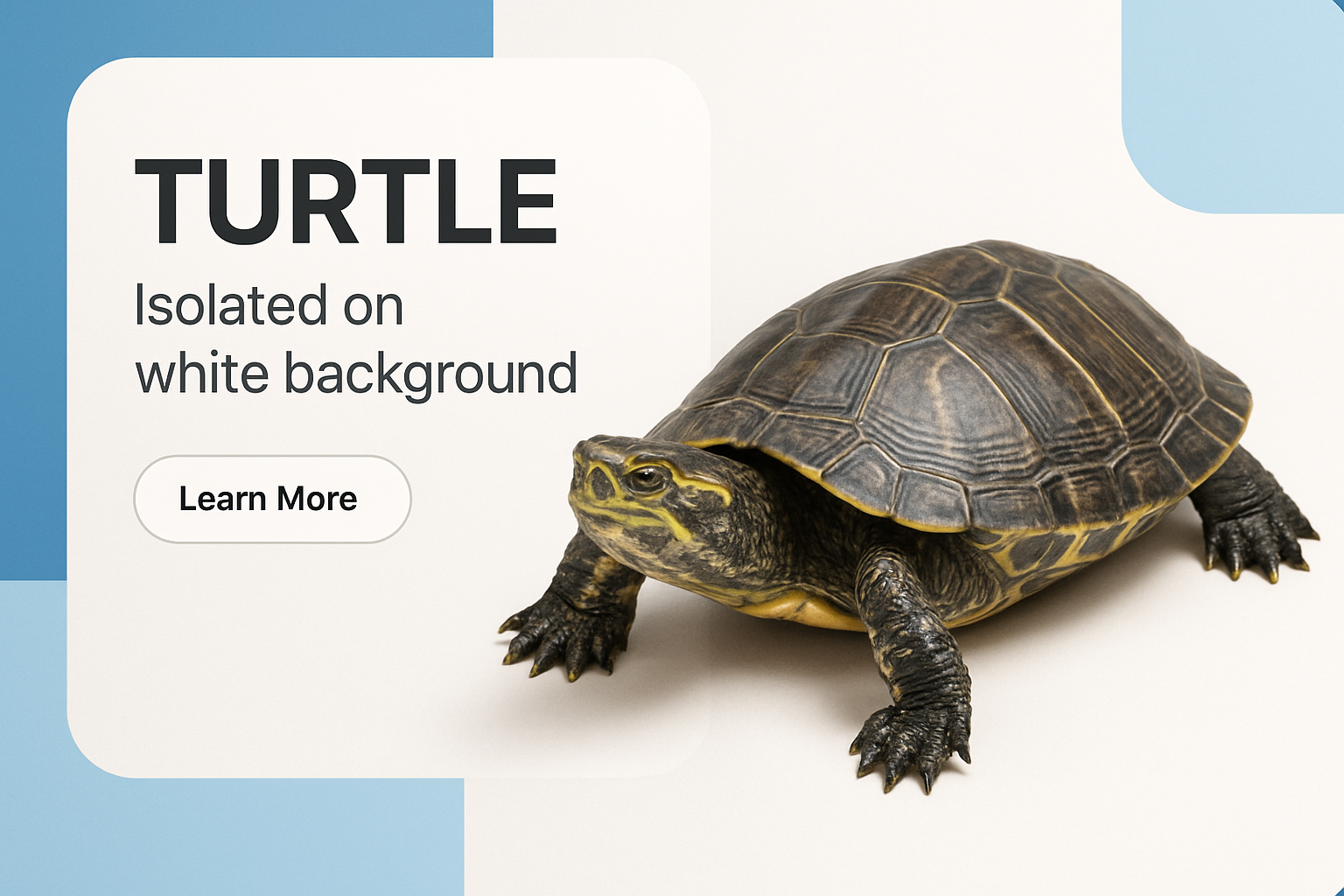 /Collection: /by davooda/Type: PNG/A realistic turtle isolated on a white background, featuring bold typography and a call-to-action button. The design emphasizes clarity and balance with geometric elements.