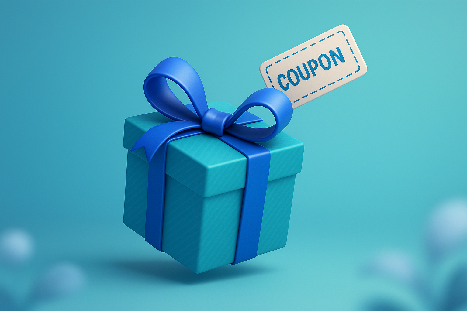 /Collection: /by davooda/Type: PNG/A vibrant 3D illustration of a gift box adorned with a blue ribbon and a coupon tag. The background features a smooth gradient, creating a visually appealing showcase for promotional materials.
