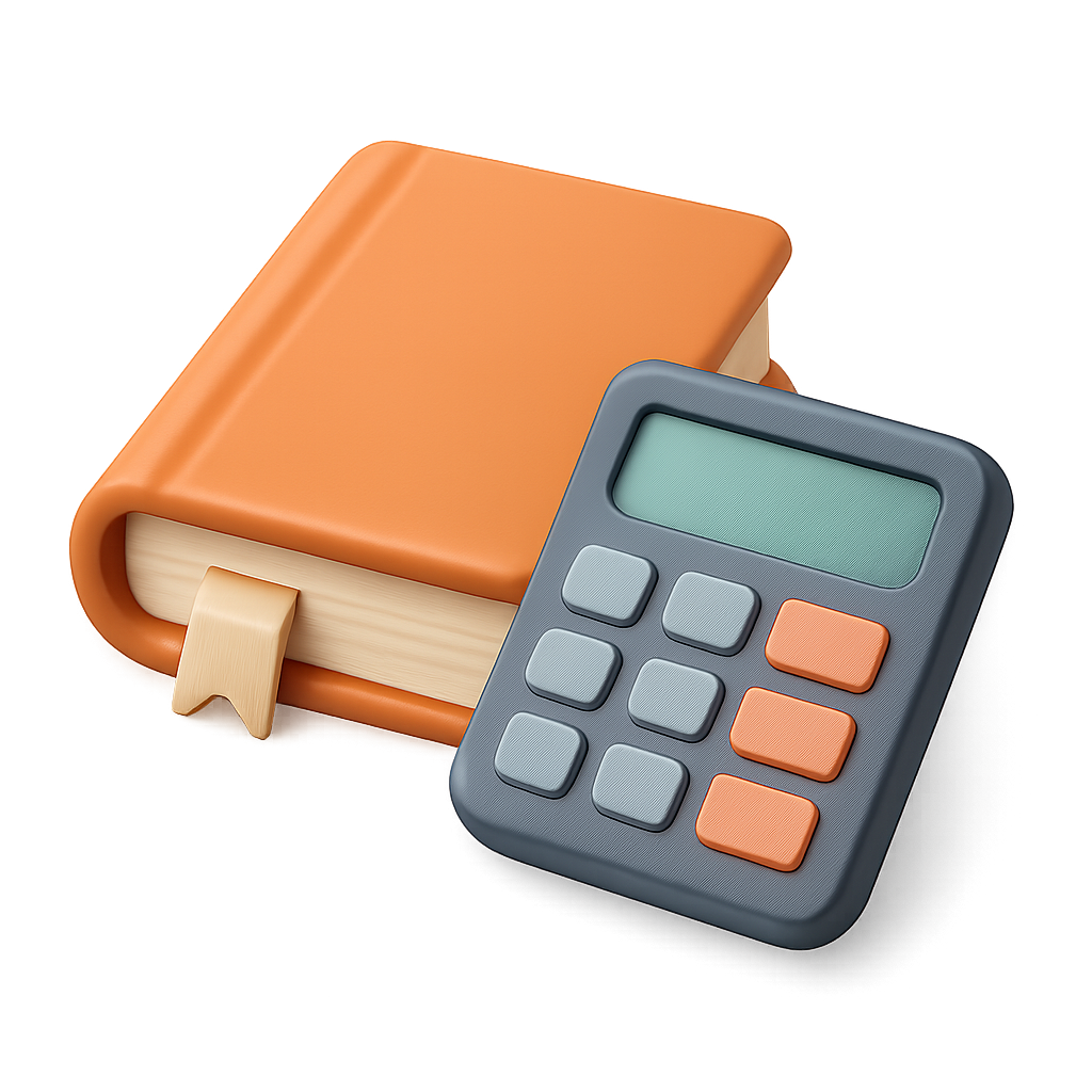 A visually appealing 3D icon featuring an orange book with a wooden spine and a gray calculator. The design emphasizes a three-quarter view and volumetric style.