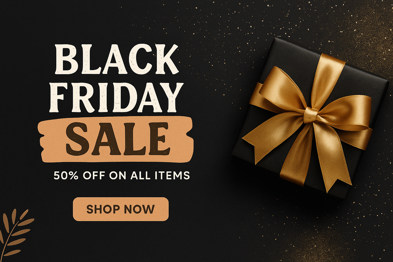 /Collection: /by davooda/Type: PNG/An elegant Black Friday sale banner featuring a gift box adorned with a golden ribbon on a black glitter background. The design promotes a 50% discount with a clear call-to-action.