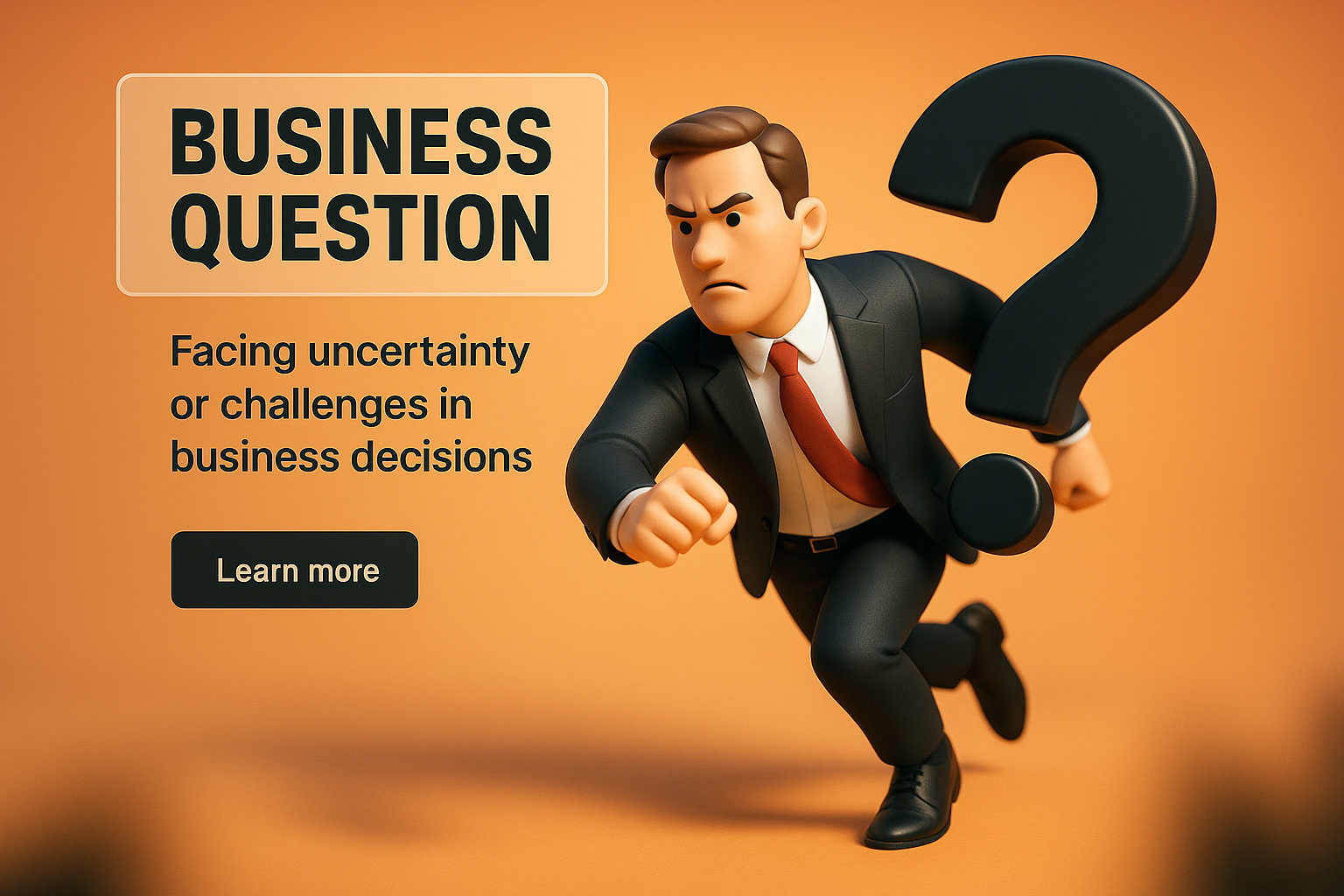 /Collection: /by davooda/Type: PNG/A vibrant business-themed graphic featuring a stylized character in a suit, conveying urgency and decision-making challenges. Ideal for online articles or advertisements focused on business solutions.