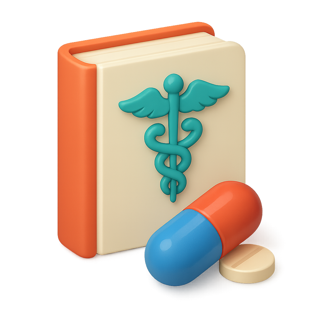 A vibrant 3D icon depicting a pharmacy theme, featuring a book with a medical symbol, a capsule, and a tablet, all rendered in a volumetric style.