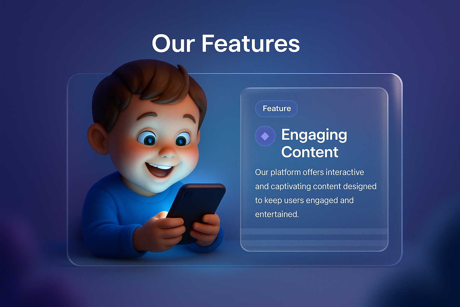 /Collection: /by davooda/Type: PNG/A 3D illustration of a joyful child holding a smartphone, with a glowing screen reflecting happiness. The design showcases engaging content features in a modern layout.