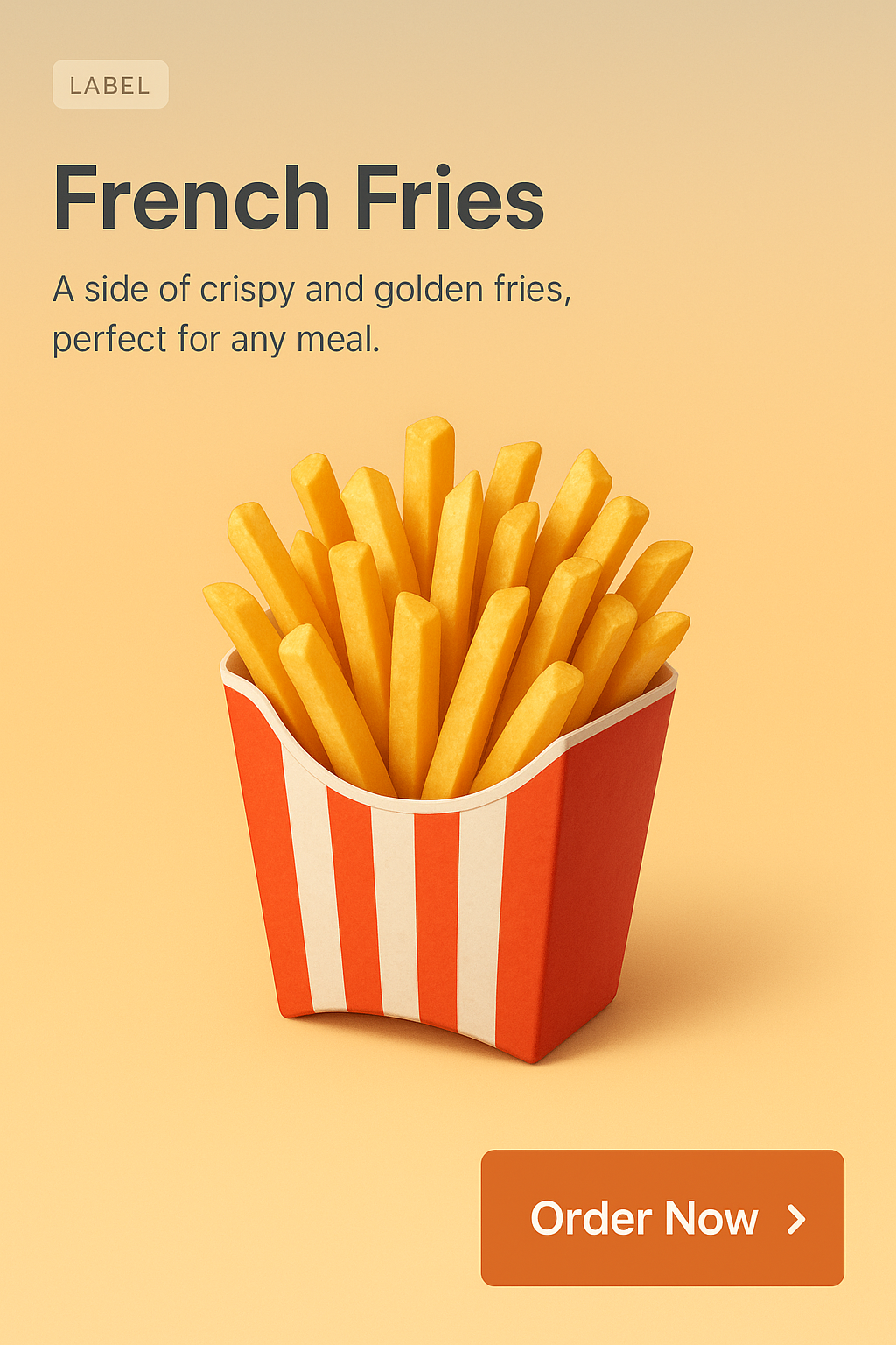 /Collection: /by davooda/Type: PNG/A detailed 3D illustration of crispy golden French fries in a striped red box, set against a smooth gradient background. The design features a clear label and call-to-action button.