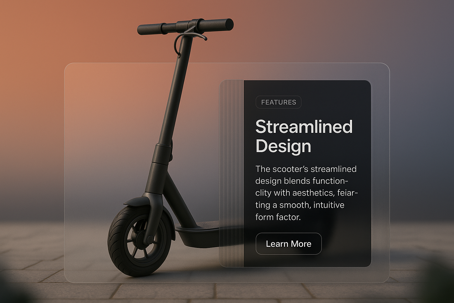 A sleek, modern scooter stands against a gradient background. The design features a transparent overlay with details highlighting its streamlined aesthetics and intuitive form.