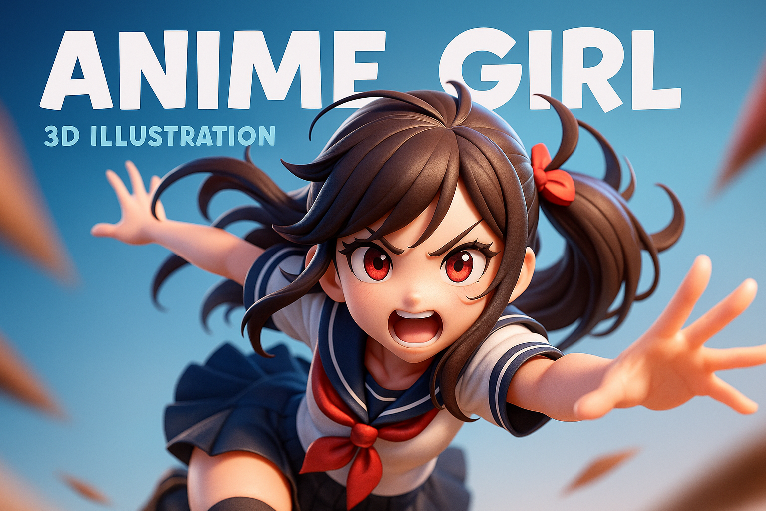 /Collection: /by davooda/Type: PNG/A vibrant 3D illustration of an anime girl in a dynamic pose, showcasing expressive features and a bold design. The background features a smooth gradient that enhances the energetic scene.